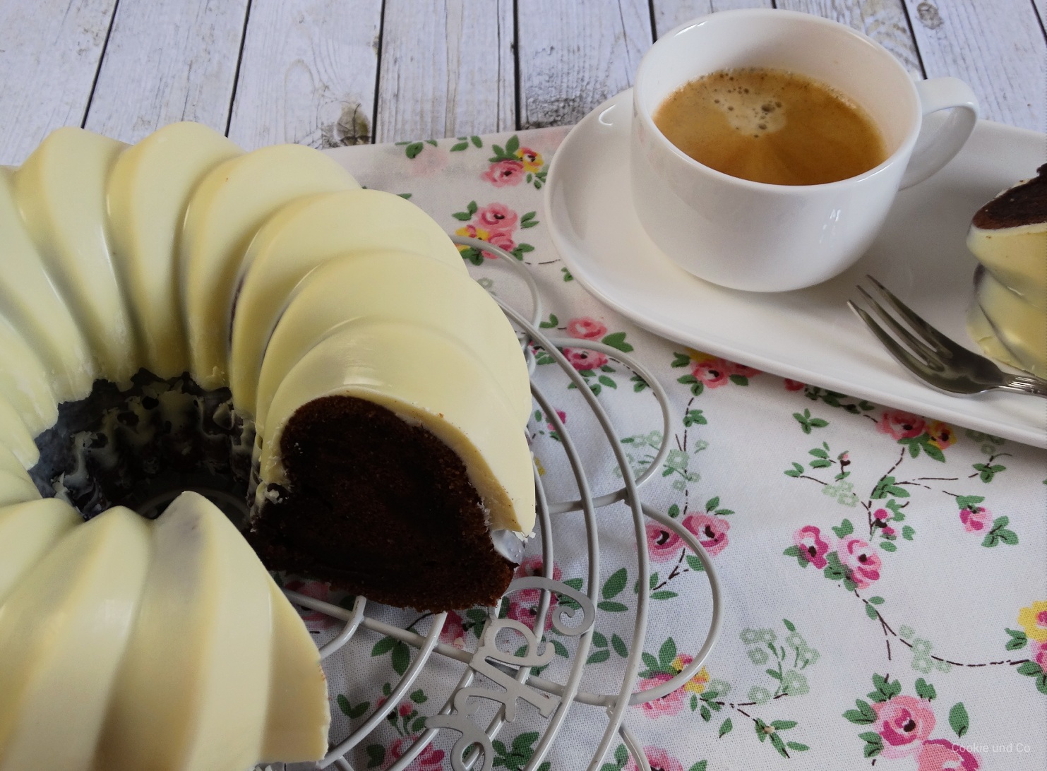Er schmeckt schön schokoladig, mit leichter Baileys-Note, ist saftig und wird geschmacklich wunderbar ergänzt durch die leckere Glasur aus weißer Schokolade, die sich auch optisch mit dem Kuchen gut ergänzt und so auf der Kaffeetafel etwas her macht.