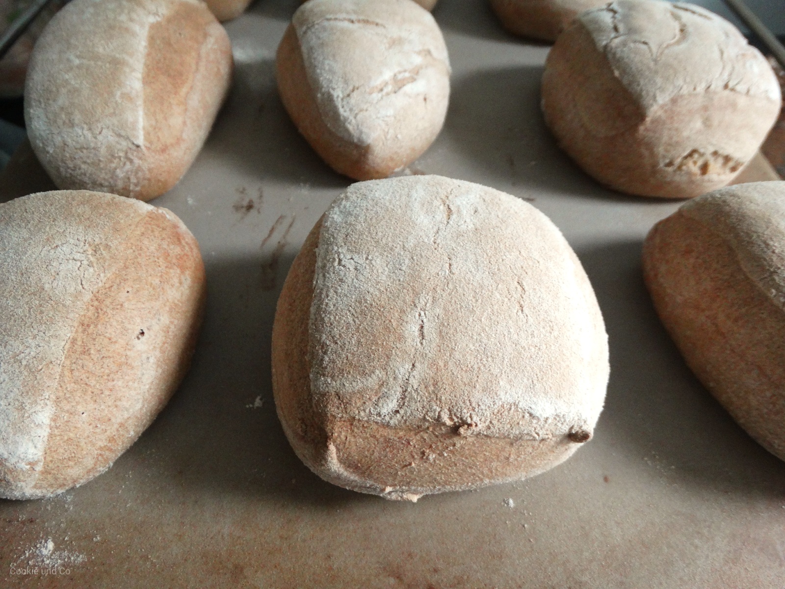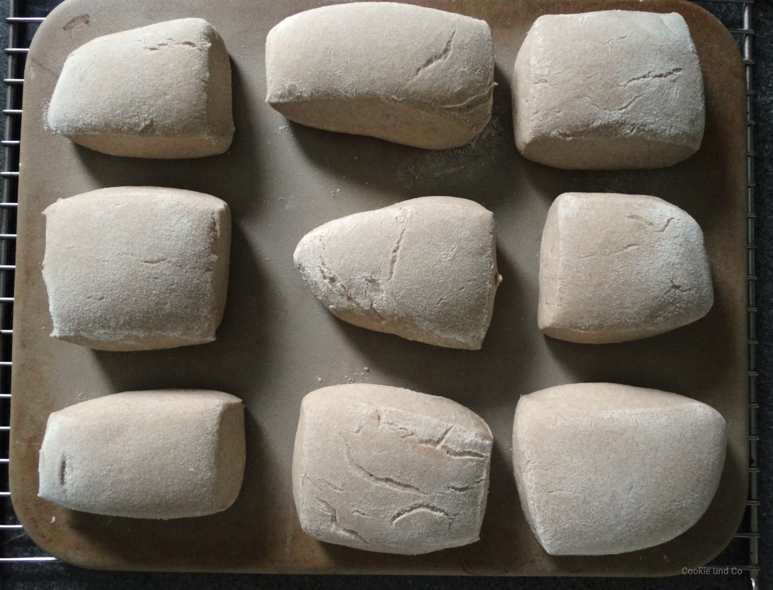 - Anschließen werden die Teiglinge für die rustikale Optik vorsichtig in Mehl gewälzt bzw. bestreut und auf einen ein Backblech (oder Zauberstein) gesetzt.
