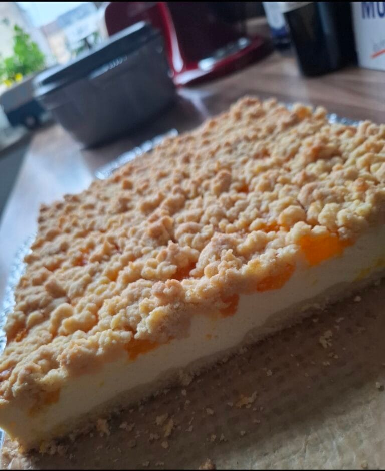 Der Kuchen schmeckt genial! Mein Mann und unser Gast waren auch ganz begeistert. Und so einfach zu machen. Die Käsemasse schmeckt auch super lecker! Ich habe 1/2 Rezept in 26er Springform gebacken, und hab für die Käsemasse nur 60gr Zucker genommen, das war für uns perfekt. In die Streusel hab ich noch etwas Zimt und Mandelblättchen gegeben. Ein toller, frischer und äußerst leckerer Kuchen. Vielen Dank für das Rezept.