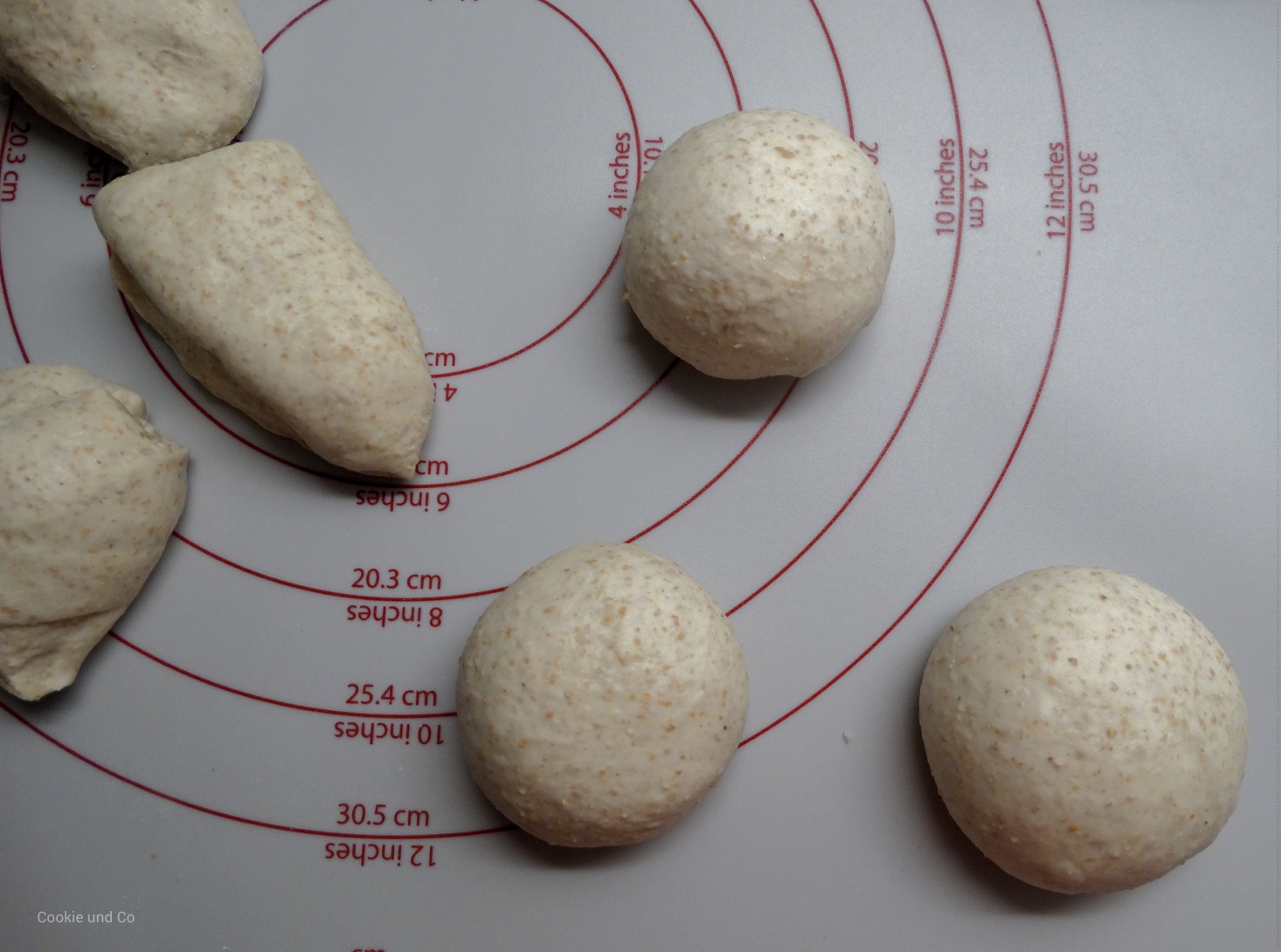 - Den Teig auf der bemehlten Arbeitsfläche in 8-10 gleich große Portionen teilen. Der Teig lässt sich sehr gut verarbeiten und ist kaum klebrig.