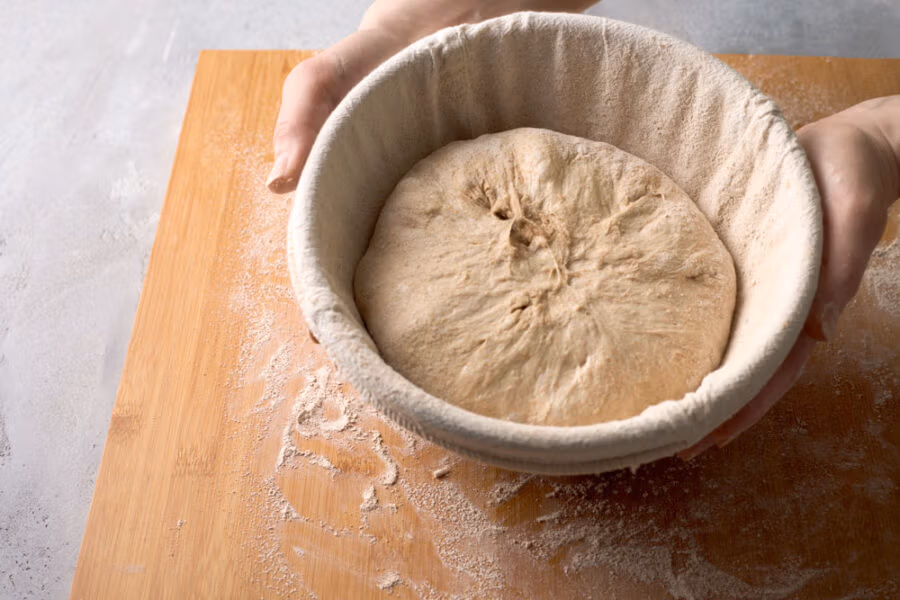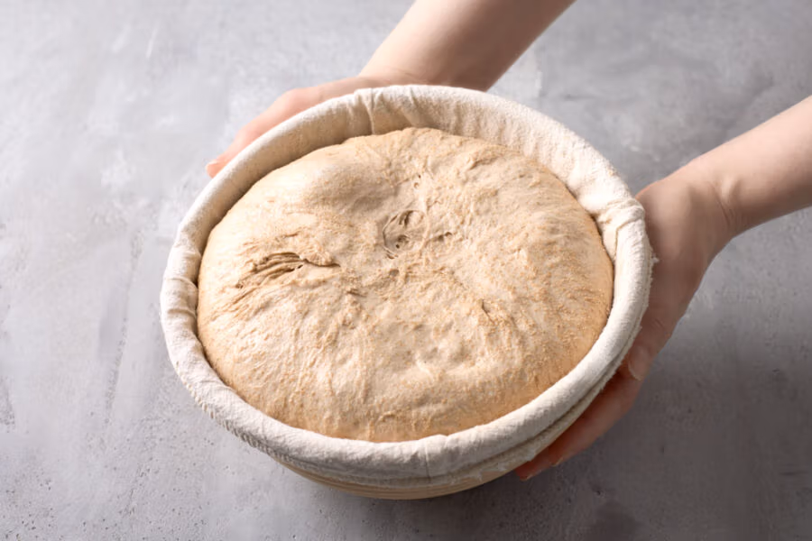 Wichtig: Dinkel mag’s sanft. Zu langes Kneten tut ihm nicht gut, Struktur holst du dir zusätzlich über Dehnen & Falten. - Gehen lassen (Stockgare) & 2-mal Falten