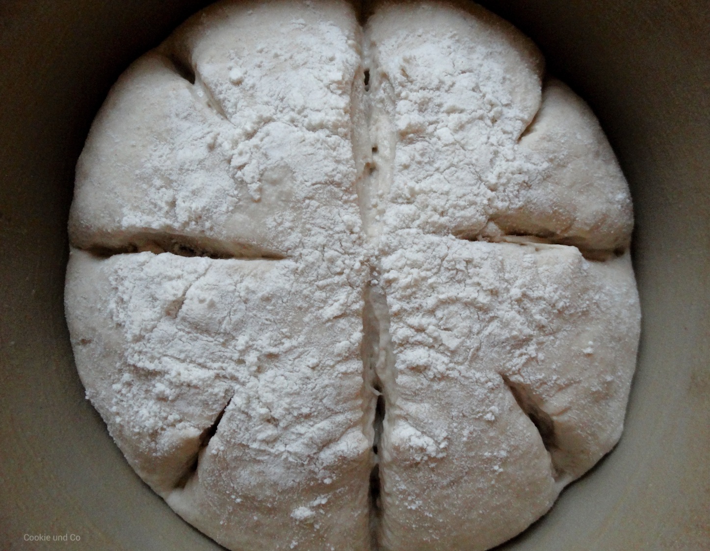 - Den Brot – Teigling großzügig in Mehl wälzen und in den Tontopf oder ein Gärkörbchen (oder alternativ: Eine Schüssel /Sieb mit einem Geschirrtuch ausgelegen mit Mehl bestreuen.) legen und abgedeckt 30 Minuten gehen lassen.