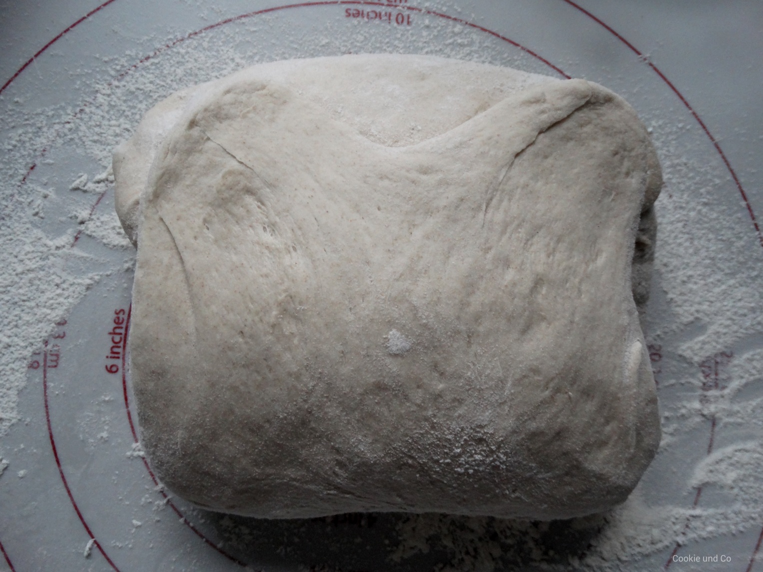 - Den Teig vorsichtig zu einem Brotlaib formen, in dem ihr ihn so oft wie einen Briefumschlag zusammenfaltet, bis ein Brotlaib entstanden ist. Anschließend noch einmal rund wirken. Dabei bitte aufpassen, das nicht allzu viel Luftbläschen im Teig zerstört werden.