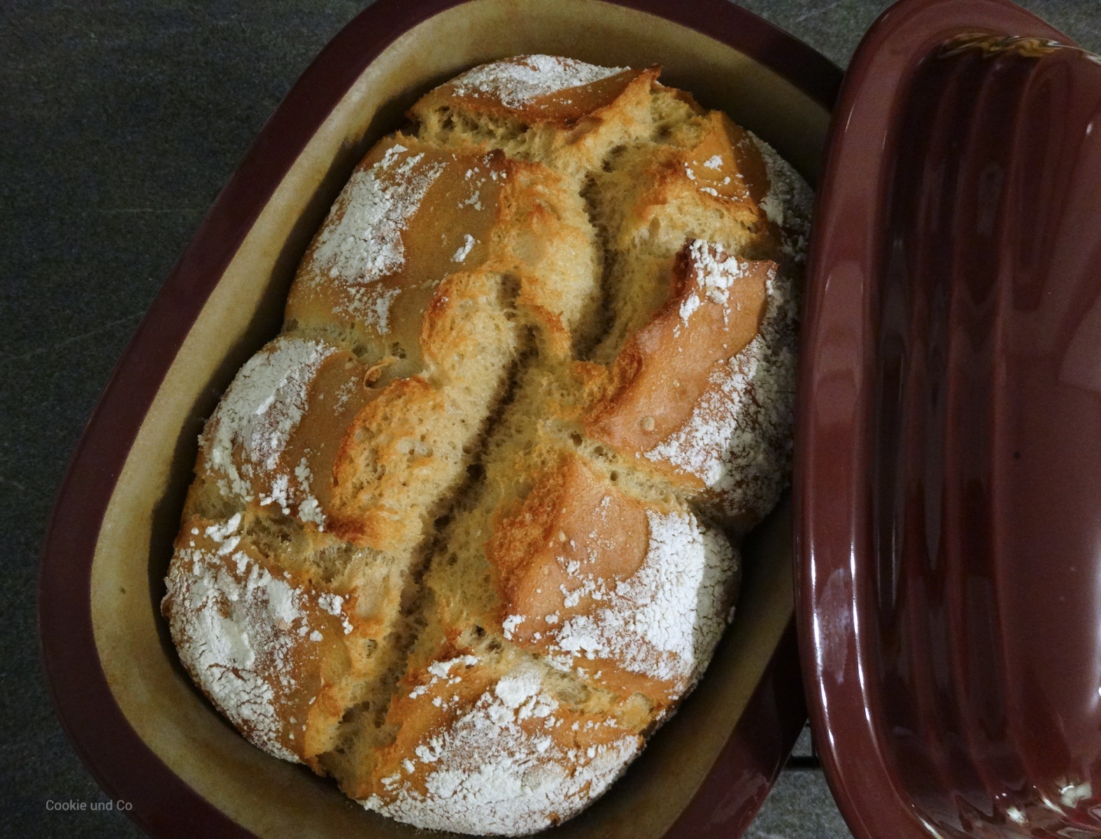 Hier als großes Brot, aus der doppelten Menge Teig im Zaubermeister/ Tontopf mit 3l Volumen gebacken: