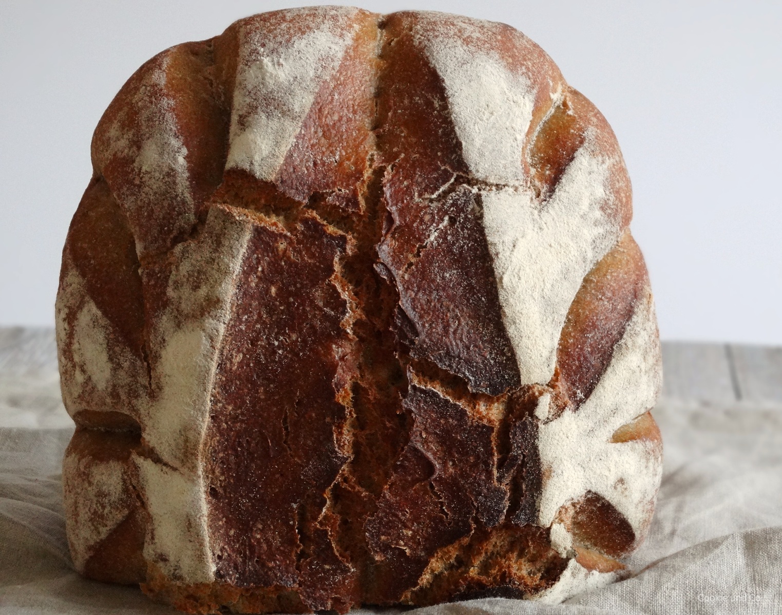 - Nach der Gehzeit (60 Minuten) schneidet ihr das Brot wie gewünscht ein, schließt den Römertopf mit dem Deckel und backt das Brot für 60 Min. im vorgeheizten Backofen (unterster Einschub) und anschließend weitere 5-10 Minuten ohne Deckel bis zur gewünschten Knusprigkeit und Bräune weiter (mit Sichtkontakt). Für die Zubereitung in einem anderen Topf, müsst ihr den Teigling aus dem Gärkörbchen vorsichtig dort hinein plumpsen lassen und anschließend einschneiden (Bitte dabei nicht verbrennen!). Deckel schließen und in den heißen Backofen geben (2. Einschub von unten).