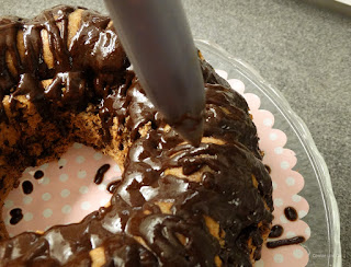 - Nach Ende der Backzeit den Kuchen in der Backform kurz auf einem Rost auskühlen lassen und dann aus der Backform auf einen Kuchenteller stürzen.