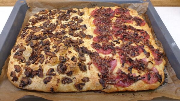 Meine Variante ist mit Champignons, Knoblauch und Thymian sowie Salami Milano mit karamellisierten Zwiebeln.