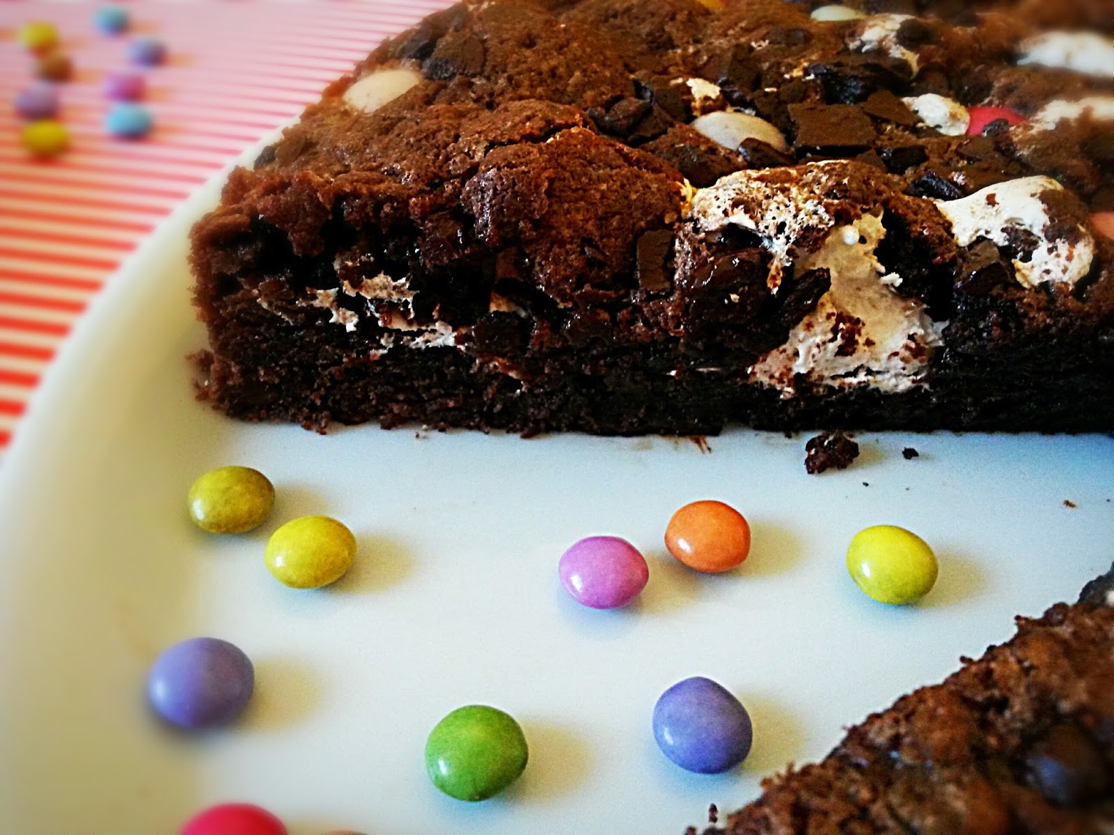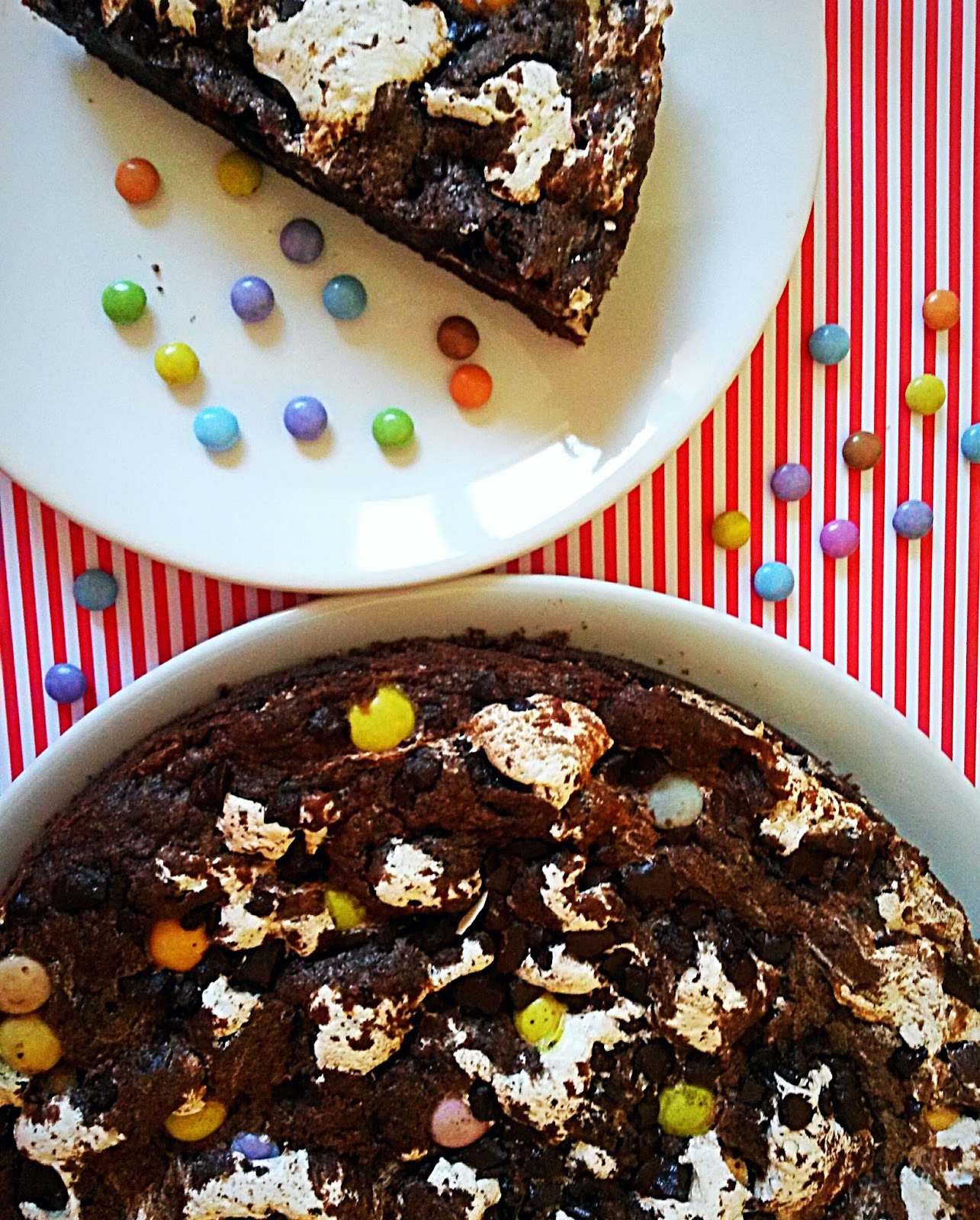 die restlichen 50g Schokolade sowie nach Belieben Smarties auf den Teig verteilen und leicht andrücken. - Für ca. 35 Minuten (2. Einschubleiste von unten ) backen. Vor dem Servieren in der Form abkühlen lassen.