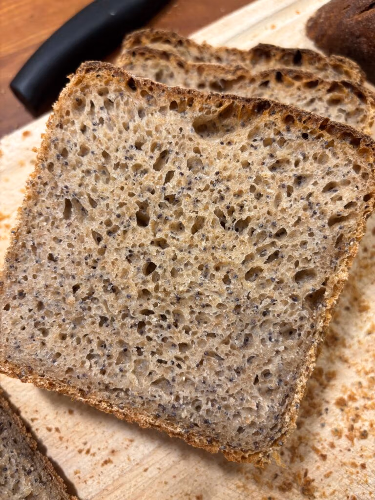 Diesmal mit höherem Vollkornanteil und Blaumohn (25g direkt mit ins Brühstück, 13g mehr Wasser) und dann etwas mehr Wasser im Hauptteig