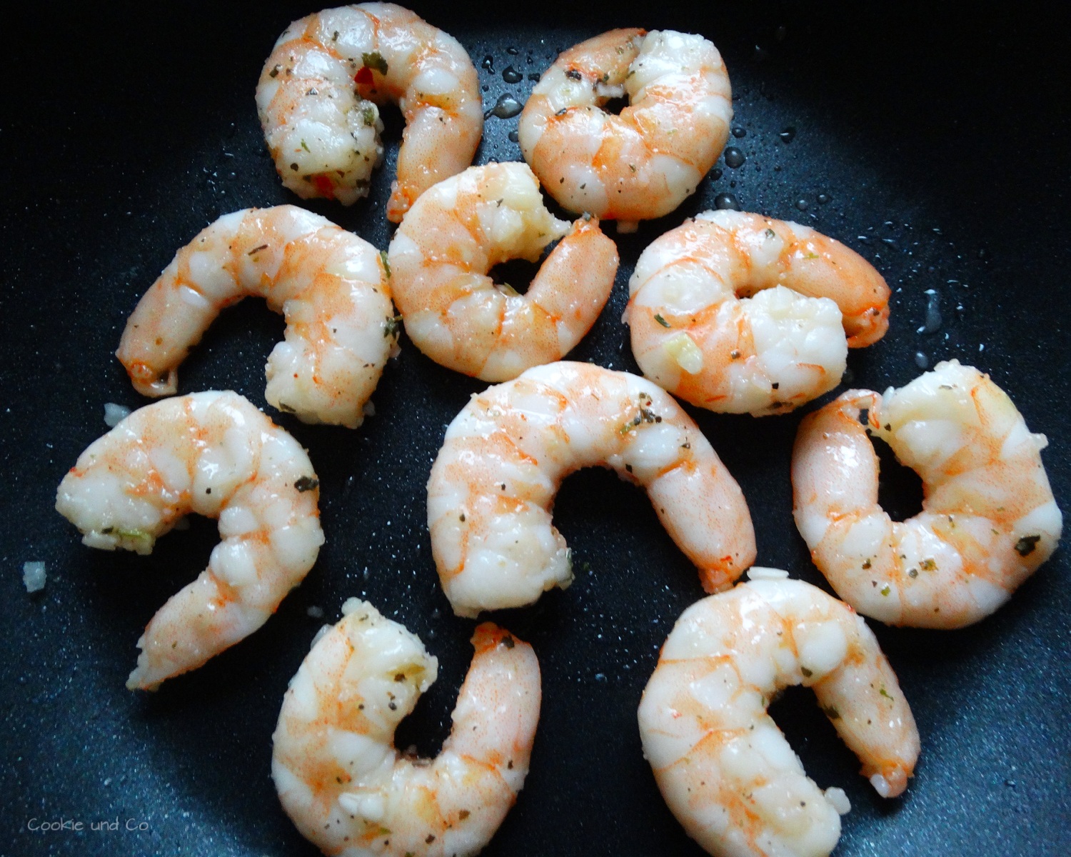 - Ebenso können nach Wunsch während der Kochzeit die Garnelen zusammen mit den Gewürzen angebraten werden.