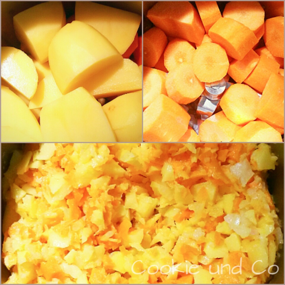 - Möhren in dicken Scheiben sowie die Kartoffeln geviertelt in den Mixtopf geben und für 5 Sek./ Stufe5 zerkleinern.