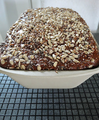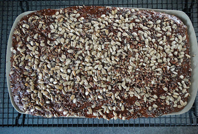 - Die Masse in die vorbereitete Form Füllen und nach Wunsch mit Saaten bestreuen.