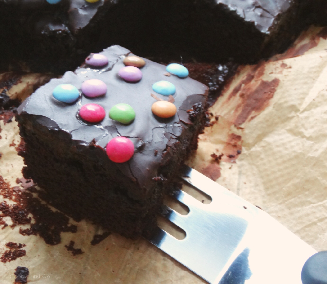- Den Schokoguss gleichmäßig über den Brownies verteilen und wenn gewünscht weiter mit verzieren, zum Beispiel mit Schokoladendekor oder Smarties.