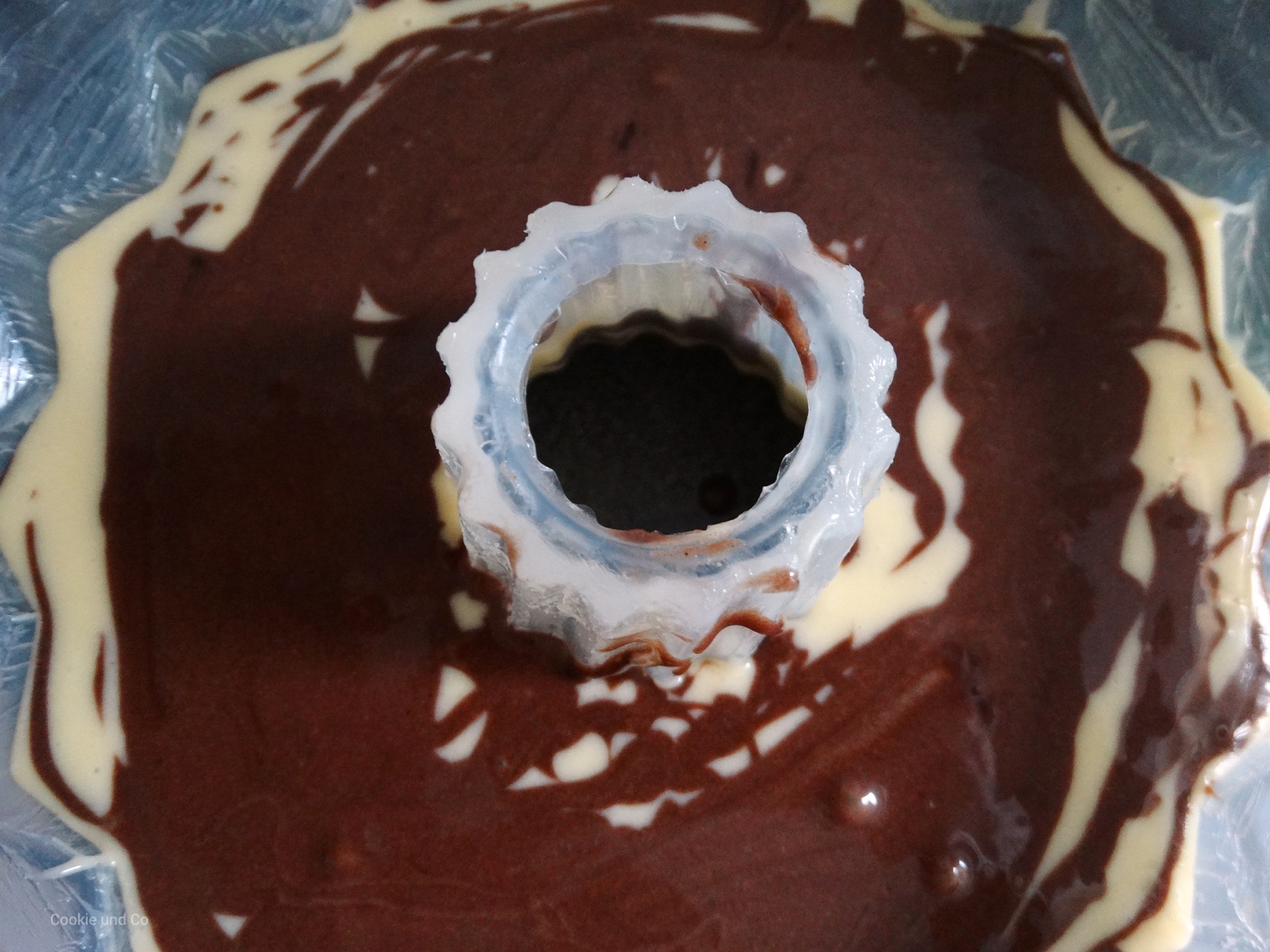 - Nun wird entweder zuerst der helle Teig in die Backform und dann der dunkle Teig obendrauf verteilt und mit einer Gabel spiralförmig unter den hellen Teig gezogen, wie bei einem Marmorkuchen ODER beide Teige werden abwechselnd in dünnen Schichten übereinander in die Backform gegeben, wie bei einem Zebrakuchen. Die „Zebrakuchen-Variante“ lässt sich bei dem recht flüssigen Teig sehr gut umsetzten.