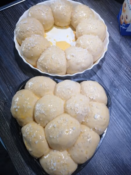 - Danach etwa 20 Teiglinge (je ca. 50 g) abstechen und rund wirken. In die Backform verteilen und gut einpacken (z. B. große Gefriertüte).
