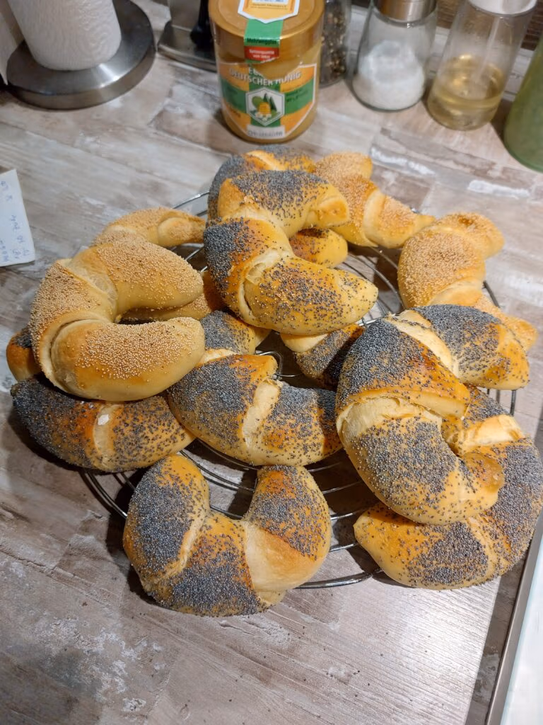 Habe die Hörnchen Natur mit Hefe gebacken und eingefroren, täglich kommt eins für drei Minuten in die Heißluft Fritteuse.