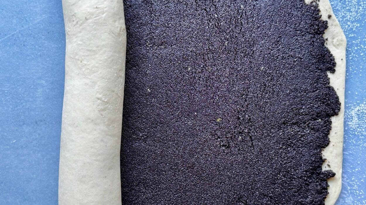 - Die Mohnfüllung gleichmäßig verstreichen, dabei ringsum einen Rand von ca. 1–2 cm frei lassen.