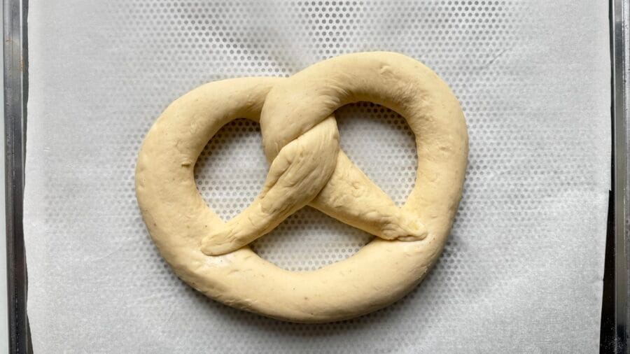 - Auf den Bauch legen: Leg die verschlungenen Enden auf den dicken Bauch der Brezel und drücke sie sanft fest. Fertig ist deine Brezel!