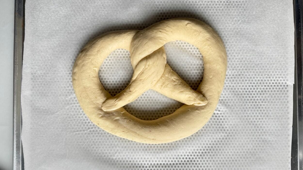 - Auf den Bauch legen: Leg die verschlungenen Enden auf den dicken Bauch der Brezel und drücke sie sanft fest. Fertig ist deine Brezel!