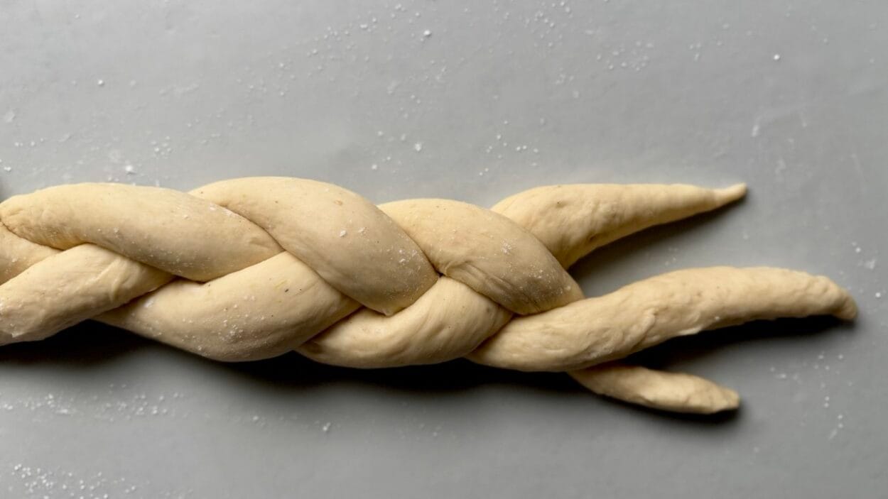 - Zopf flechten: Jede Teigkugel zu einem Strang rollen (ca. 25–30 cm) und zu einem klassischen 3er-Zopf flechten.