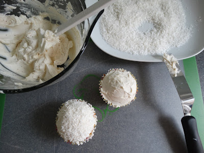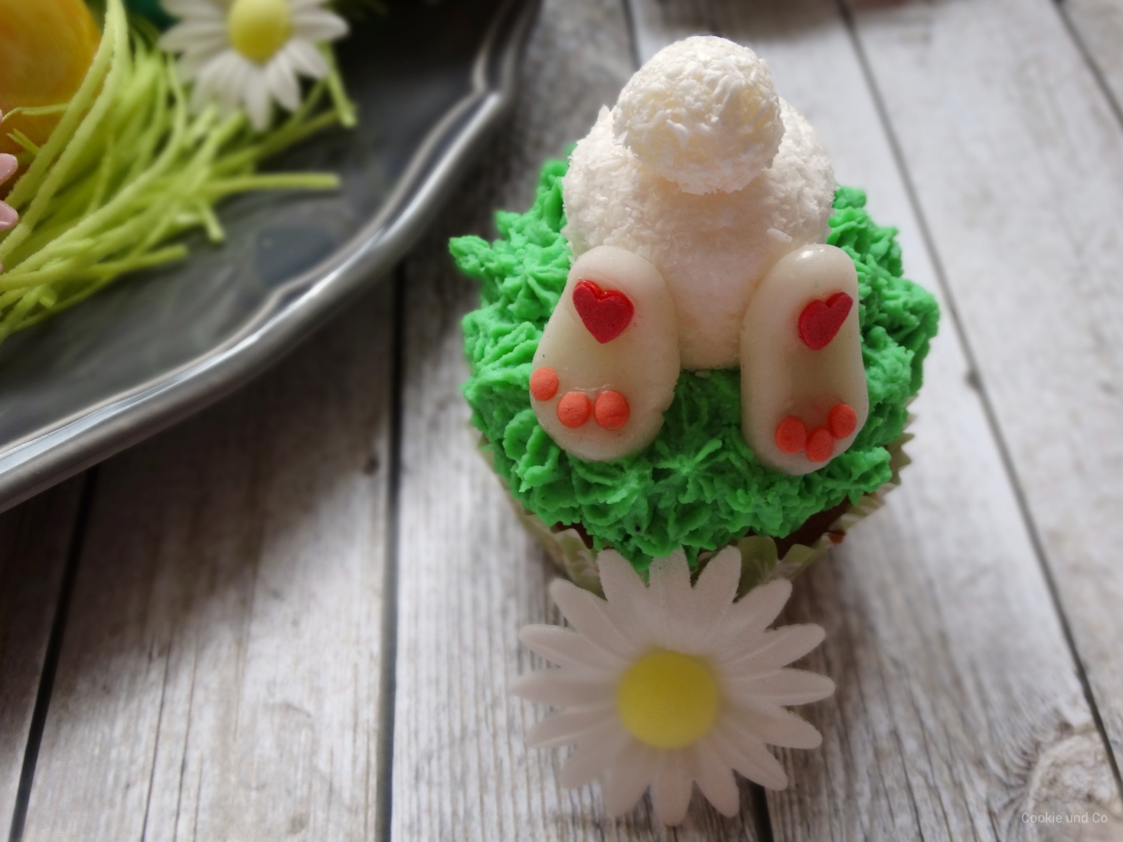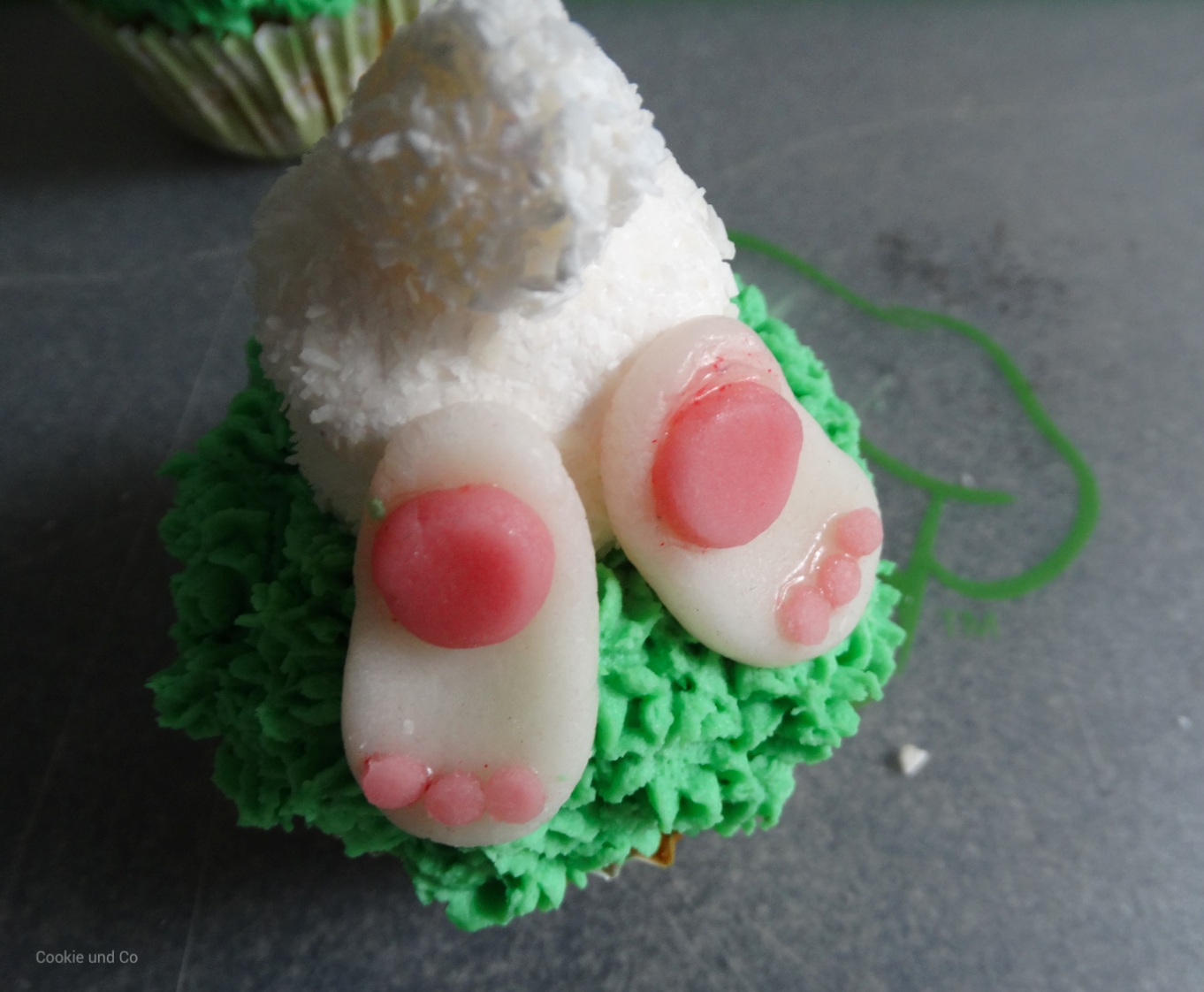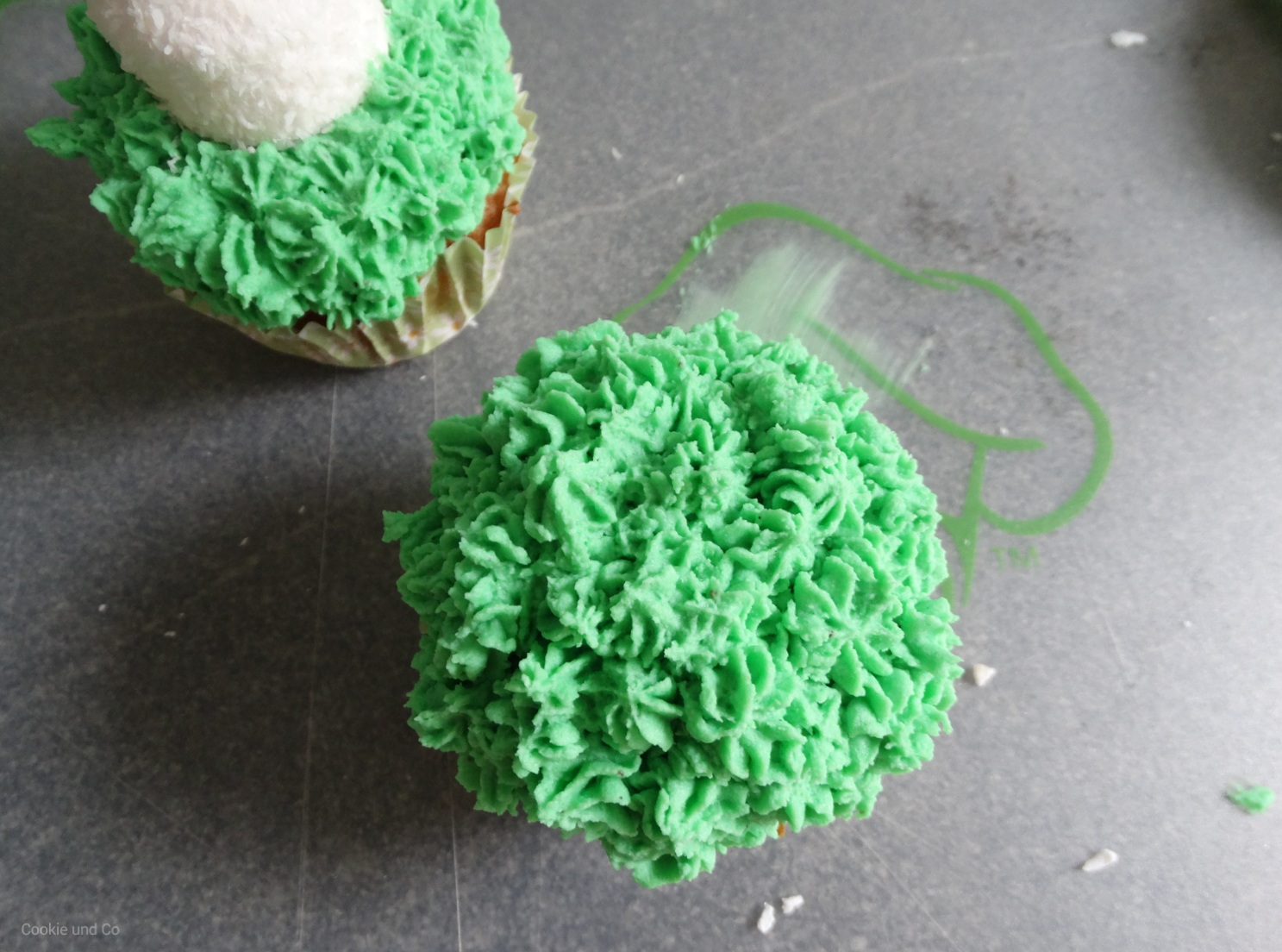 - Für die Hasenpopo Muffins braucht ihr etwa 2 Päckchen Mascarpone (mit 6 El Puderzucker und etwas Vanilleextrakt gesüßt, evtl.etwas SanApart), grüne Lebensmittelfarbe, weiße Modellierschokolade o.ä., rosa Modellierschokolade o.ä., je ein Zahnstocher, Kokosraspel
