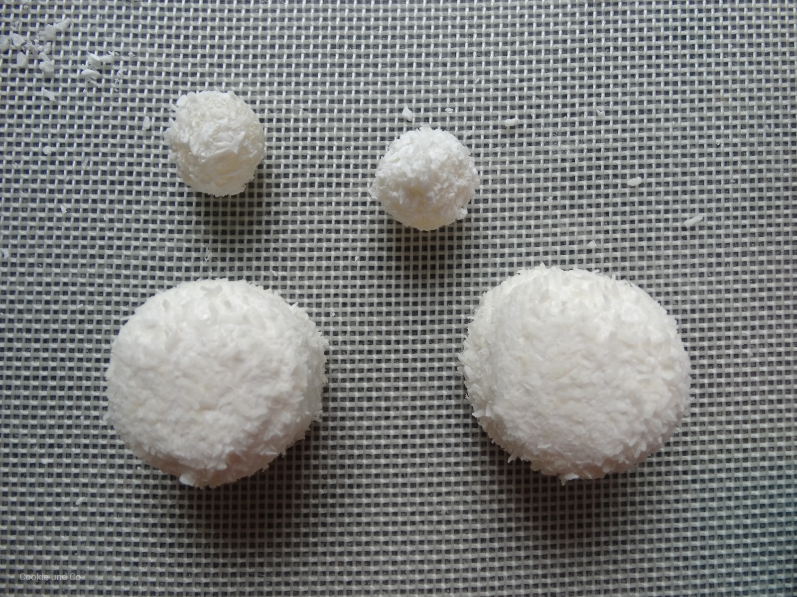 Der Körper kann auch aus einer Kugel Modellierschokolade o.ä hergestelltund dann in Kokos gewälzt werden. (Vorher in Zuckerkleber wenden.) |