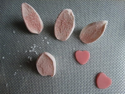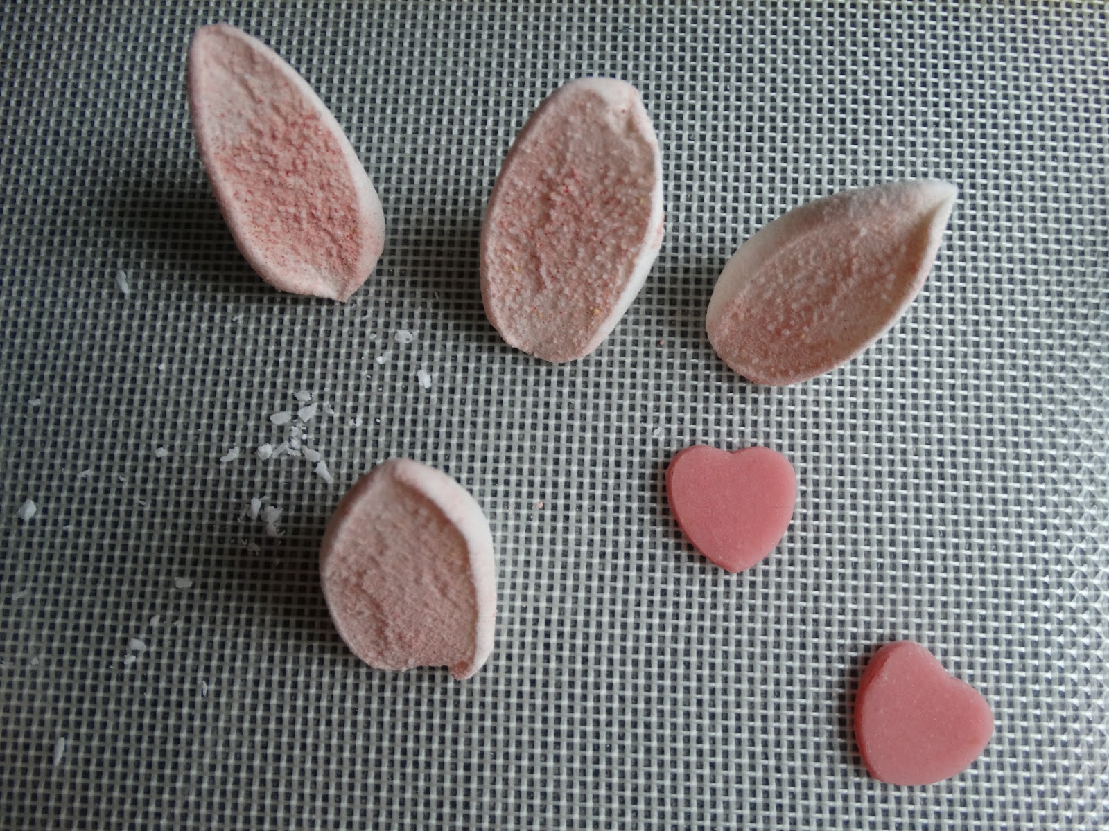 Für die Nase kleine Herzen aus rosa Modellierschokolade o.ä. ausstechen. |