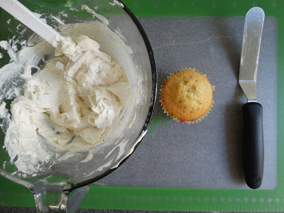 Muffin mit Mascarpone einstreichen, so dass eine Rundung entsteht. |