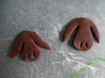 Ohren mit Zahnstochern befestigen und Augen und Nase einfach andrücken,hält von alleine. |