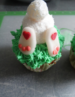 Für die Pfoten einfach Kugeln aus Modellierschokolade o.ä. flach drücken unddann oval formen. Häschen mit Zahnstocher befestigen, Pfoten ankleben.(Wichtig: Fondant erst vor dem Verzehr!) |