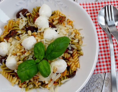 (Nun die fertige Pasta nicht mehr zu lange in Topf oder Pfanne lassen, da sonst der Mozarella schmilzt.)