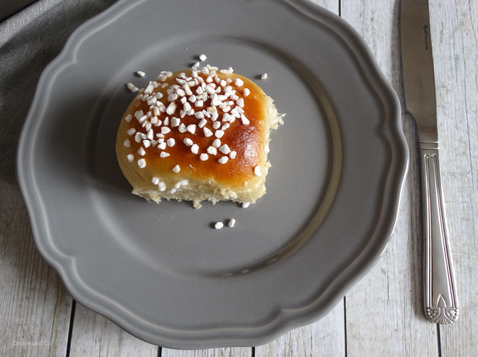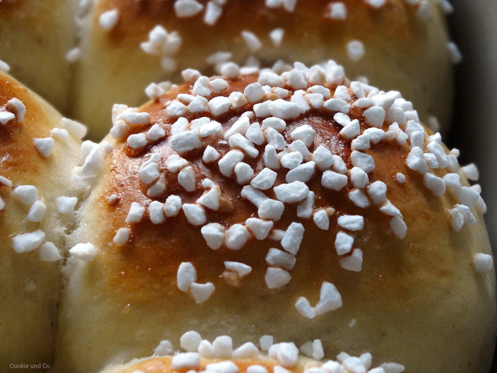 Weiterhin habe ich noch etwas gerieben Tonkabohne mit in den Teig gegeben und die ursprüngliche Menge von Kardamom reduziert. Dies könnt ihr natürlich ganz nach eurem Geschmack variieren. Die Pikku Pulla sind hier nur mit Hagelzucker bestreut, typischerweise werden sie wohl auch manchmal noch mit gehackten Nüssen oder Mandeln bestreut.