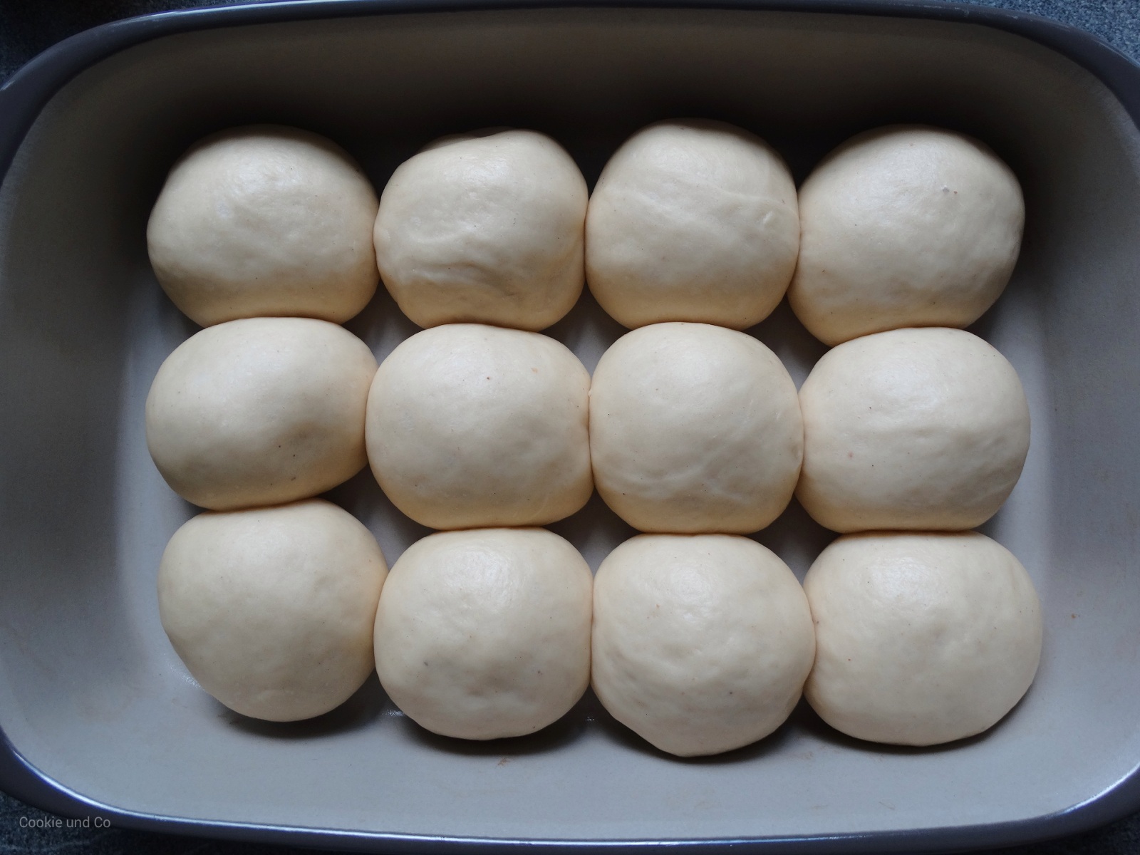- Danach aus dem Teig 12 einzelne Brötchen schleifen und auf den leicht gefettetes Backblech oder eine große Auflaufform legen. An einem warmen Ort abgedeckt 60 Min. gehen lassen ODER über Nacht abgedeckt im Kühlschrank (meiner hat 5°C).