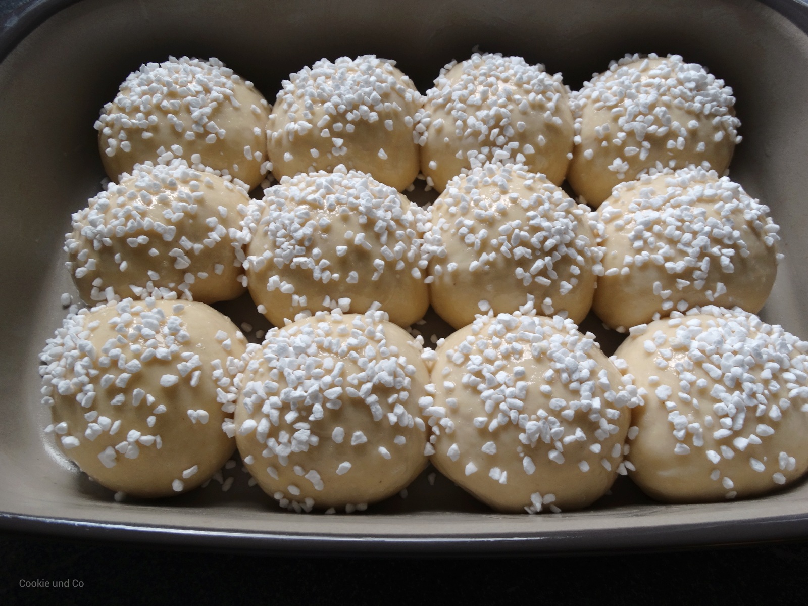 - Nach der Gehzeit die Brötchen mit dem übrigen Eiklar bestreichen und mit Hagelzucker (und evtl. gehackten Haselnüssen) bestreuen.