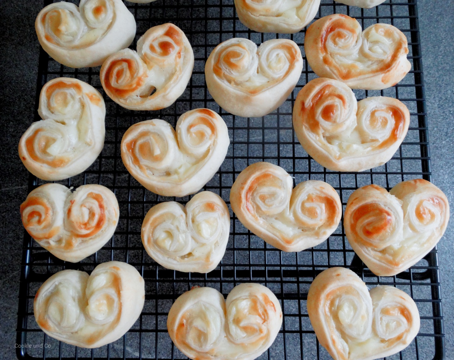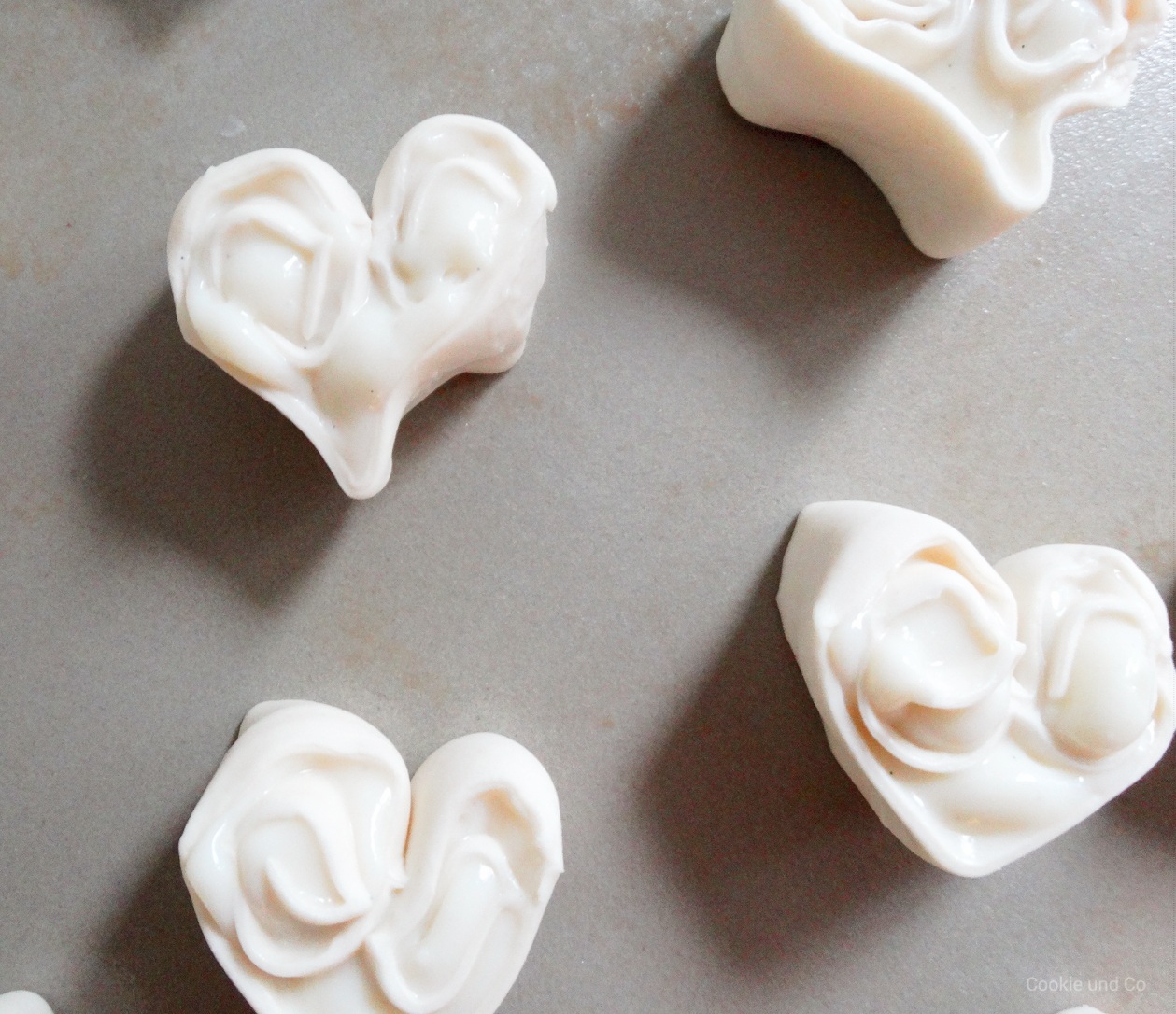 - Die fertig geformten Herzen werden nun auf ein mit Backpapier belegtes Backblech gelegt. Ich habe die Herzen insgesamt auf zwei Bleche verteilt.