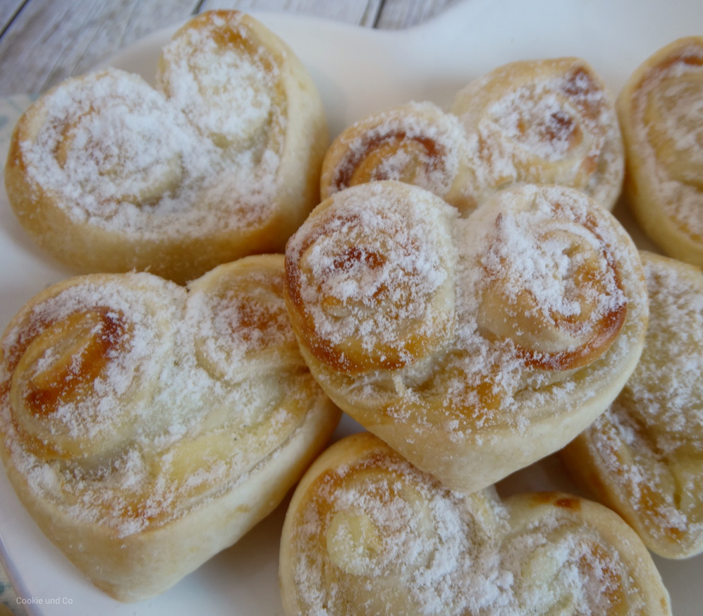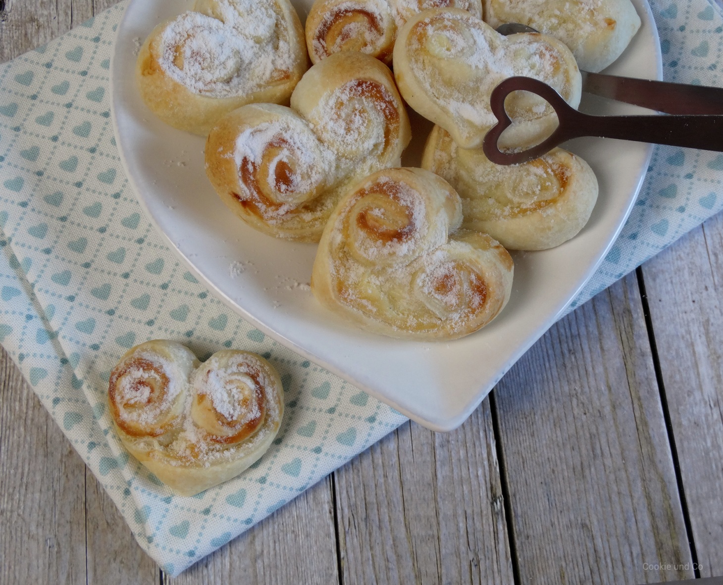 Ihr könnt aus diesem Rezept auch größere Pudding-Herzen backen. Dann rollt ihr den Teig einfach zu einem größerem Rechteck aus und fahrt wie im Rezept beschrieben fort. Die Backzeit verlängert sich dann entsprechend. Die Puddingfüllung ist nicht allzu dick in den Herzen, damit sich diese gut aufrollen lassen und sich nicht dabei der ganze Pudding rausdrückt. Falls ihr mehr Füllung in den Herzen haben wollt, müsst ihr entsprechend etwas mehr Pudding vorab kochen. Uns haben die Herzen aber so sehr gut und saftig genug geschmeckt und sie waren ruck zu aufgefuttert :-). Vielleicht überrascht ihr eure lieben ja auch mit diesen kleinen Pudding-Herzen zum Valentinstag oder holt euch noch andere Anregungen bei meinen Bloggerkollegen, die bei dieser Bloggerparade mitwirken. Die Links findet ihr wie immer unter dem Rezept.♥