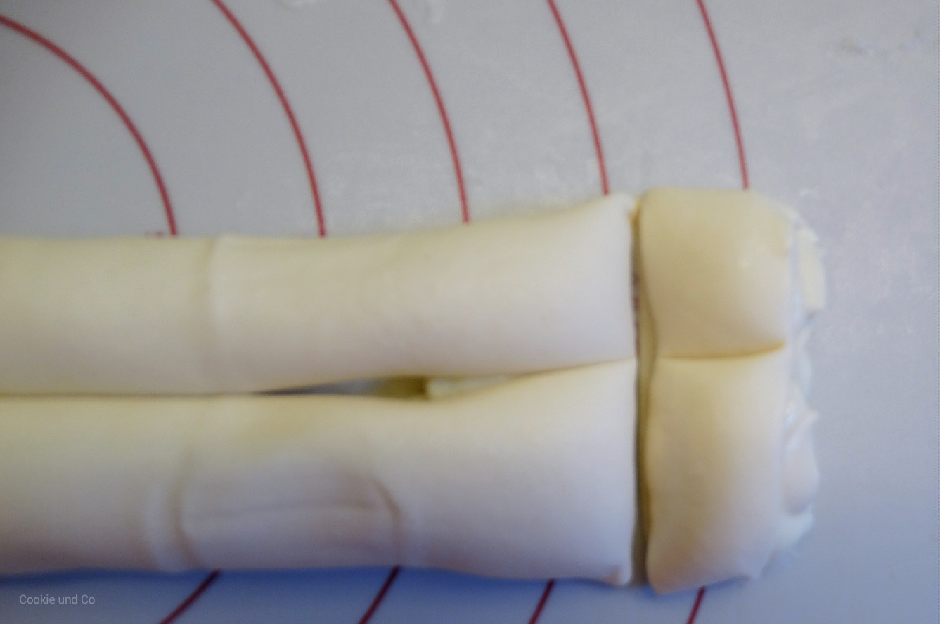 - Nun wird der ausgerollte Teig von beiden langen Seiten her zur Mitte zusammengerollt, biss sich die Teigrollen in der Mitte treffen.