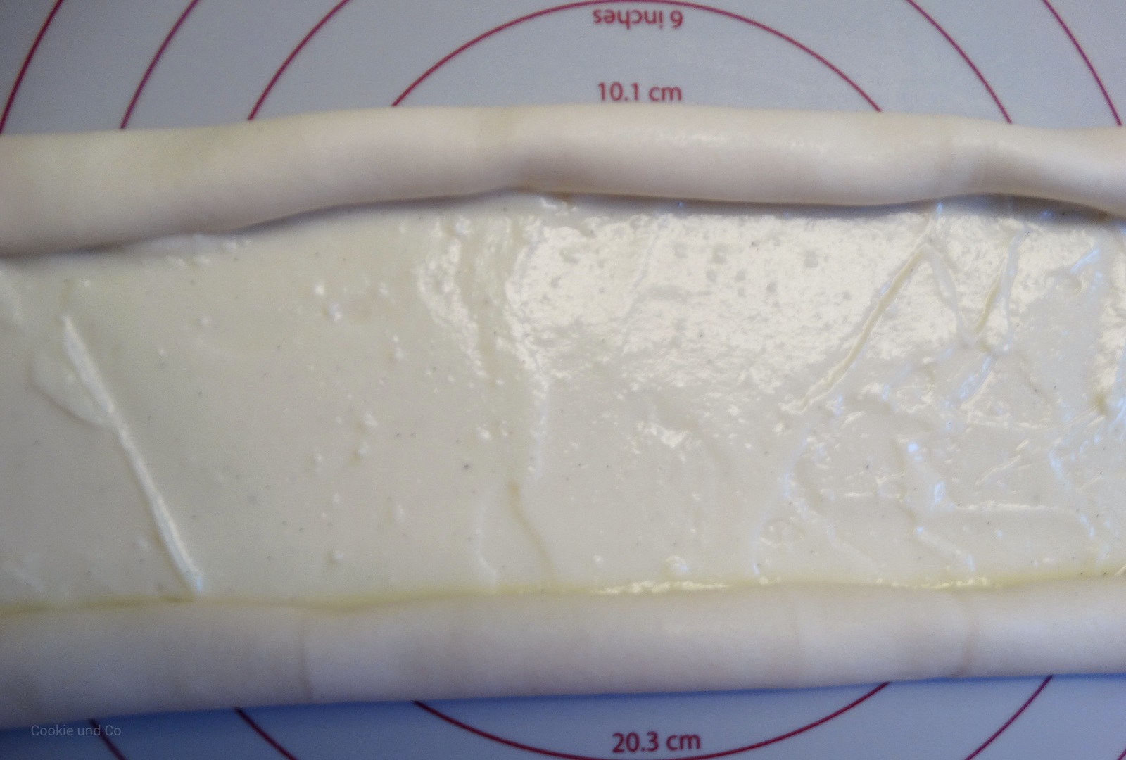 - Nach der Gehzeit wird je die Hälfte des Teiges (am besten auf einer Silikonmatte) zu einem Rechteck von etwa 20x40cm ausgerollt und mit der Hälfte des Puddings bestrichen. Am besten verteilt sich der Pudding mit einer kleinen Streichpalette.