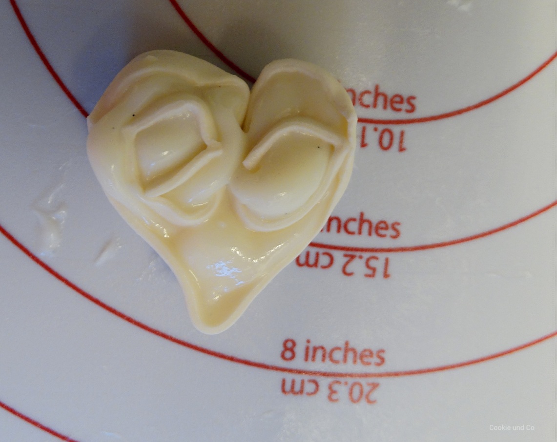 - Nun werden Herzen geformt: Bei jedem Stück werden nun die beiden runden Seiten leicht zusammen geschoben und die untere Seite des Teigstücks zu einer Spitze zusammen gedrückt. Dabei aufpassen, dass der Pudding nicht heraus gedrückt wird.