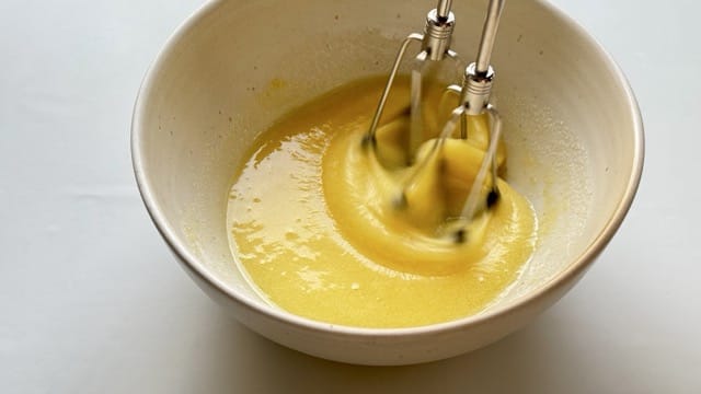 - Gib die Eier zusammen mit dem Zucker, Vanillezucker und Salz in eine Rührschüssel und schlage alles mit dem Handrührgerät (Rührstäbe) ca. 2–3 Minuten schaumig auf, bis die Masse heller und cremig wird.120 g Zucker10 g Vanillezucker2 Eier½ TL Salz