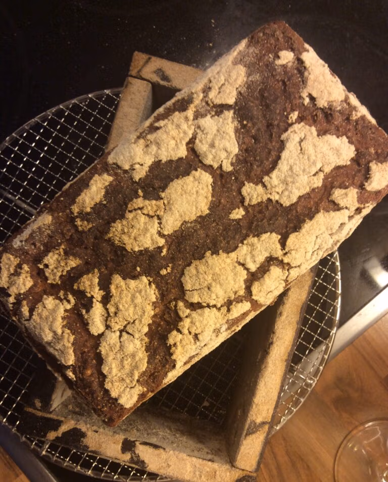 - Nach dem Backen vollständig auskühlen lassen. Wer möchte, kann das Brot direkt nach dem Backen mit etwas Wasser absprühen.
