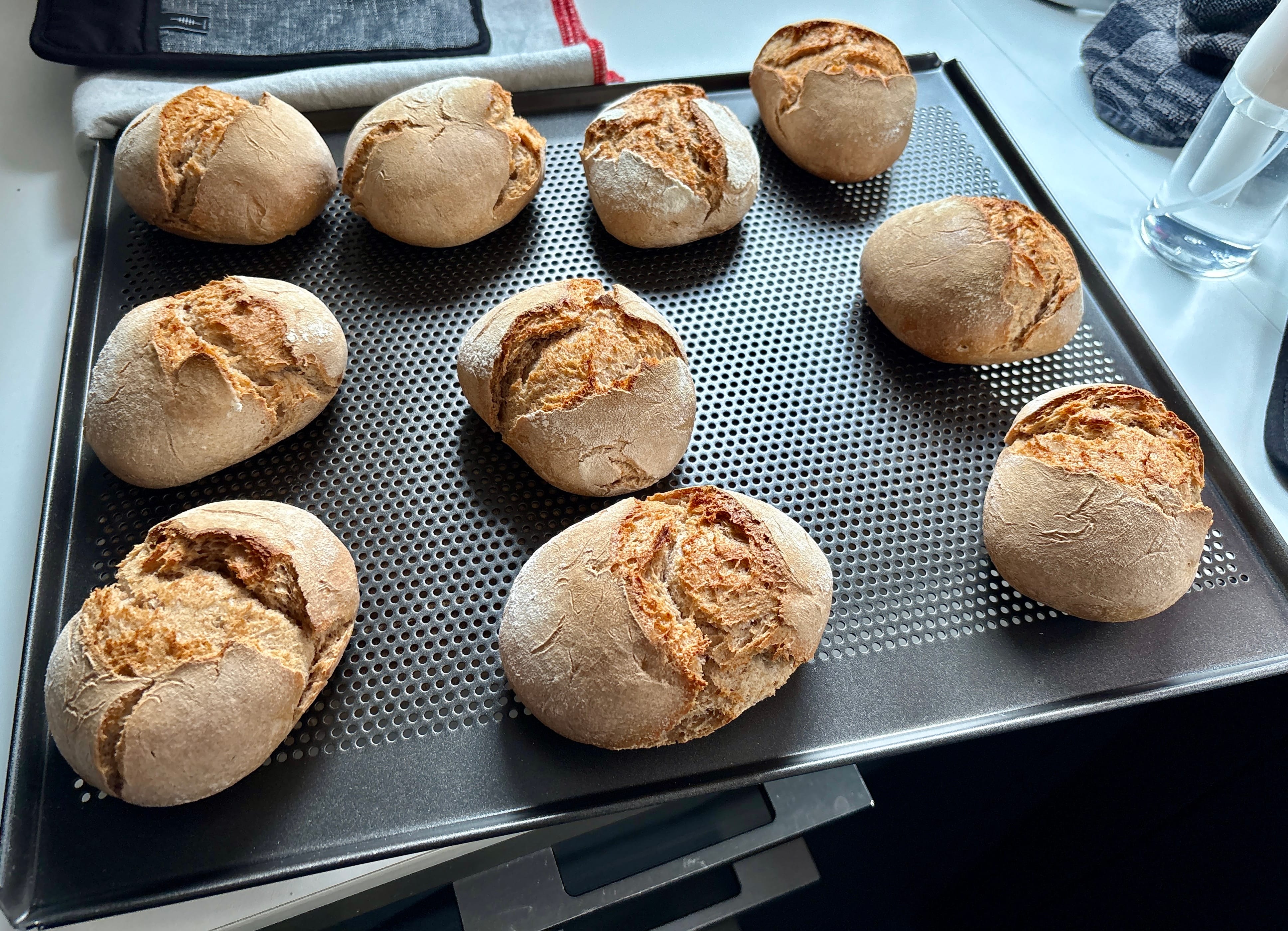 - Die Brötchen in den heißen Ofen einschießen und schwaden (Dampfstoß). Nach 10 Minuten den Dampf ablassen, die Temperatur auf 210 °C reduzieren und weitere 8–10 Minuten goldbraun backen. (Gesamtbackzeit: 18–20 Minuten)
