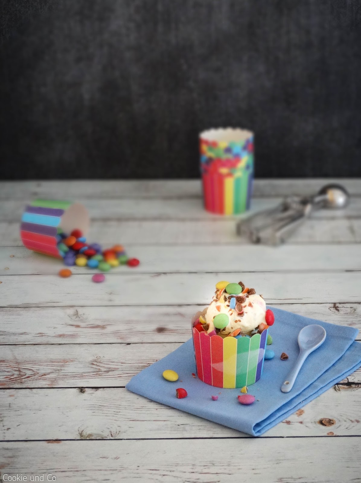- Die Eismasse in einer Eismaschine oder der Kitchenaid Speiseeismaschine gefrieren lassen. Jetzt nach Wunsch klein gehackte Süßigkeiten unterheben. Am besten danach nochmal für etwa 30 Minuten ins Eisfach geben.