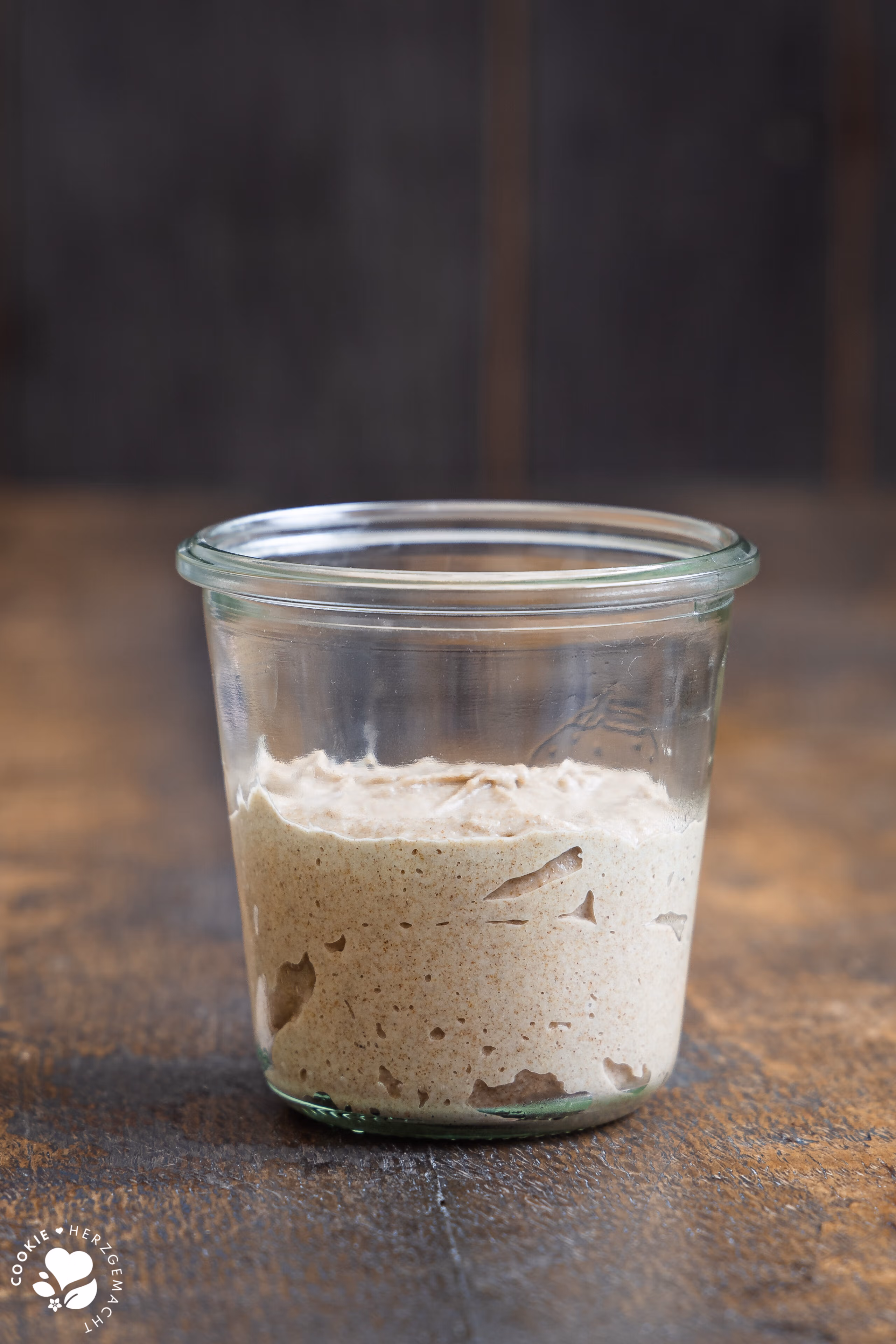 50 g Roggenvollkornmehl mit 60 g lauwarmem Wasser glattrühren. Ins Glas füllen, die Füllhöhe mit einem Gummiband markieren, locker abdecken und warm (26–28 °C) stehen lassen.