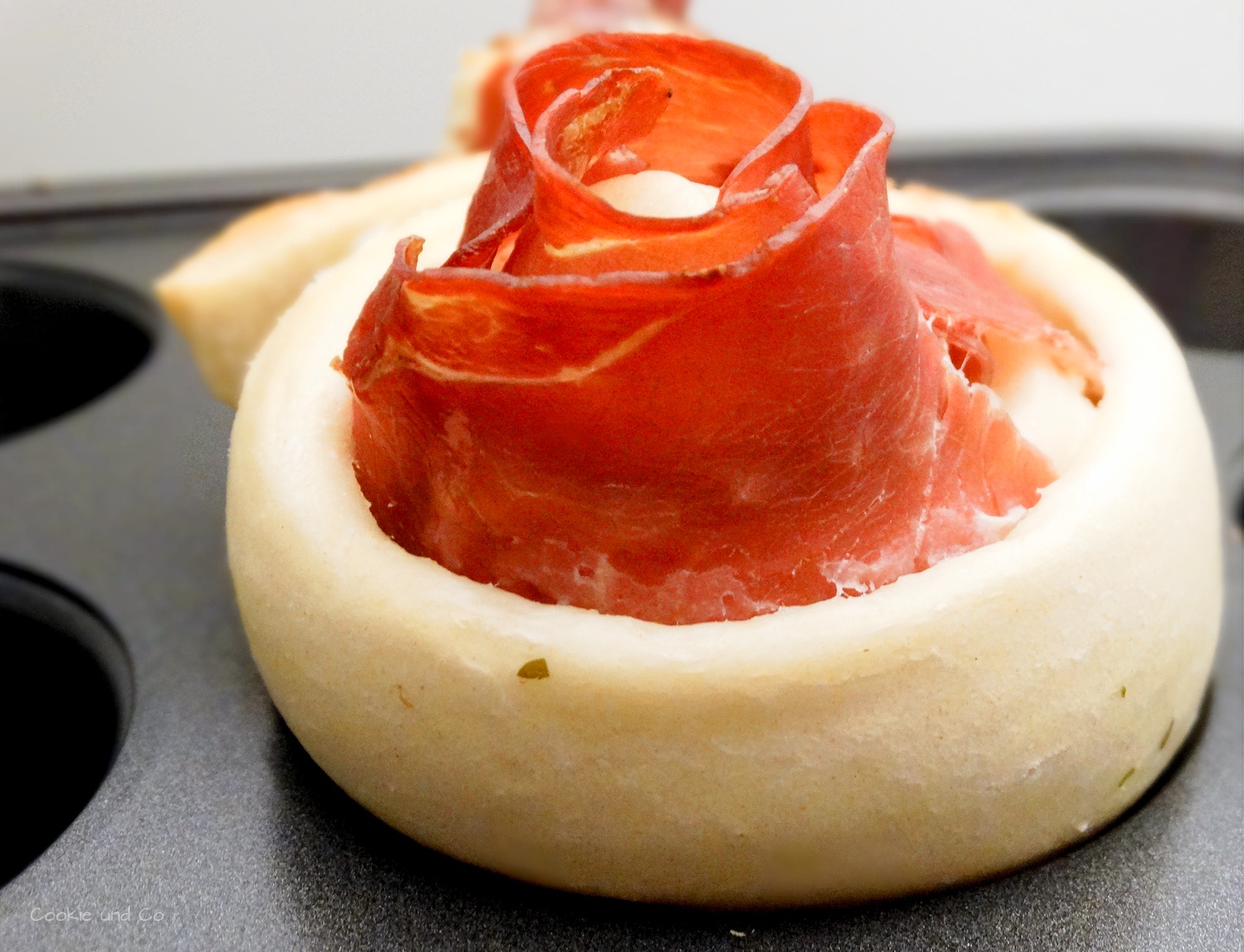 - Wenn alle Schinkenrosen fertig aufgerollt sind, werden diese in der Muffin -Backform für etwa 30 Minuten im kalten Backofen bei 200°C Ober-Unter-Hitze gebacken (…auf dem Rost im unteren Drittel). Gerne könnt ihr bei Backbeginn etwas Wasser in den Ofen sprühen bzw. einmal Schwaden.