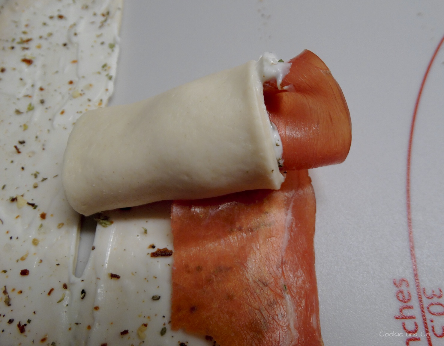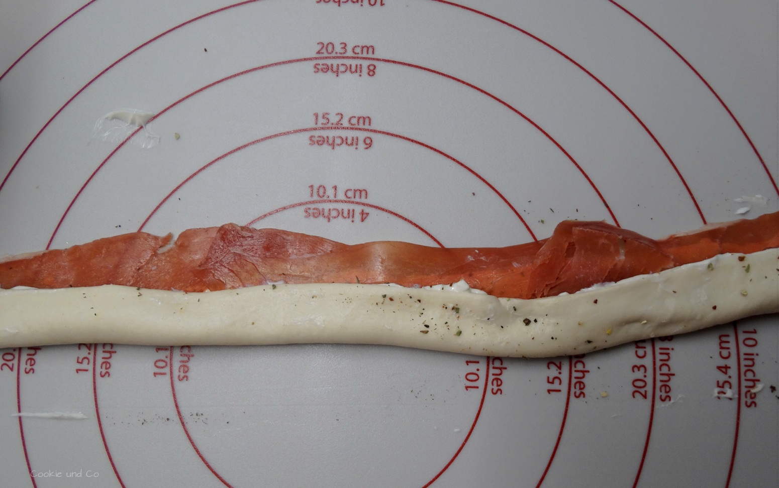 - Anschließen jeweils den halben Teig auf einer Silikonmatte mit dem Teigroller zu einem Rechteck von etwa 30x40cm ausrollen und mit Hilfe einer kleinen Streichpalette mit dem Frischkäse oder dem Schmand bestreichen.
