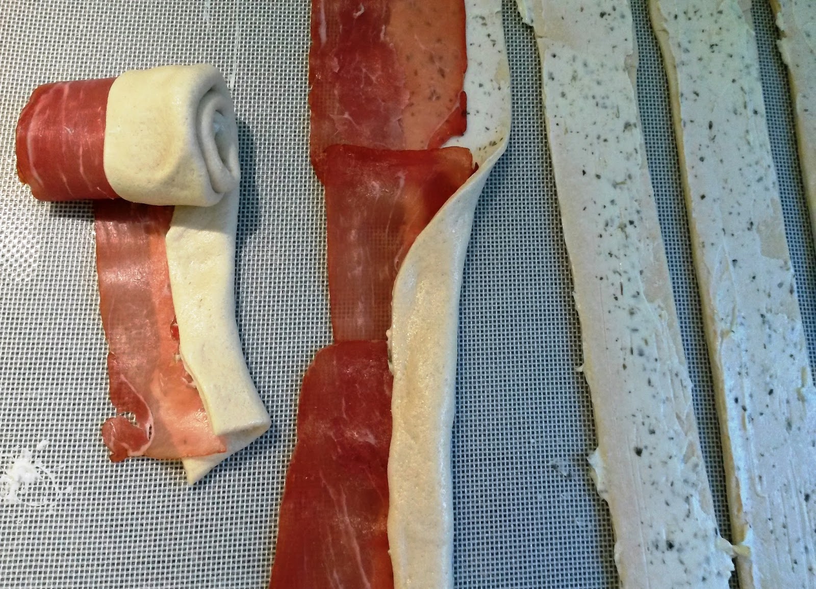 - Dann legt ihr die Schinkenscheiben auf die Teigstreifen, so dass der halbe Streifen auf dem Teig liegt und die andere Hälfte nicht. Da mir die Schinkenrosen mit manchen Schinkensorten zu salzig sind, halbiere ich die Schinkenstreifen manchmal auch der Länge nach bevor ich sie auf den Teig lege. Ich habe euch auf den Bildern beide Varianten gezeigt.