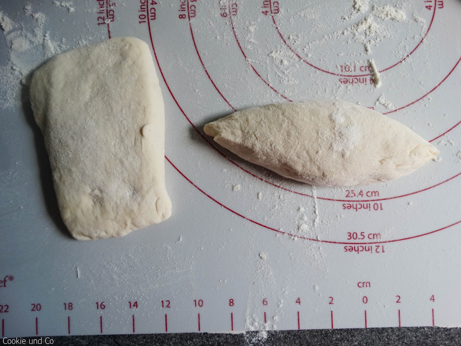 - Nach der Ruhezeit den Teig vorsichtig auf eine leicht bemehlte Arbeitsfläche gleiten lassen und 8-10 Teile abstechen.