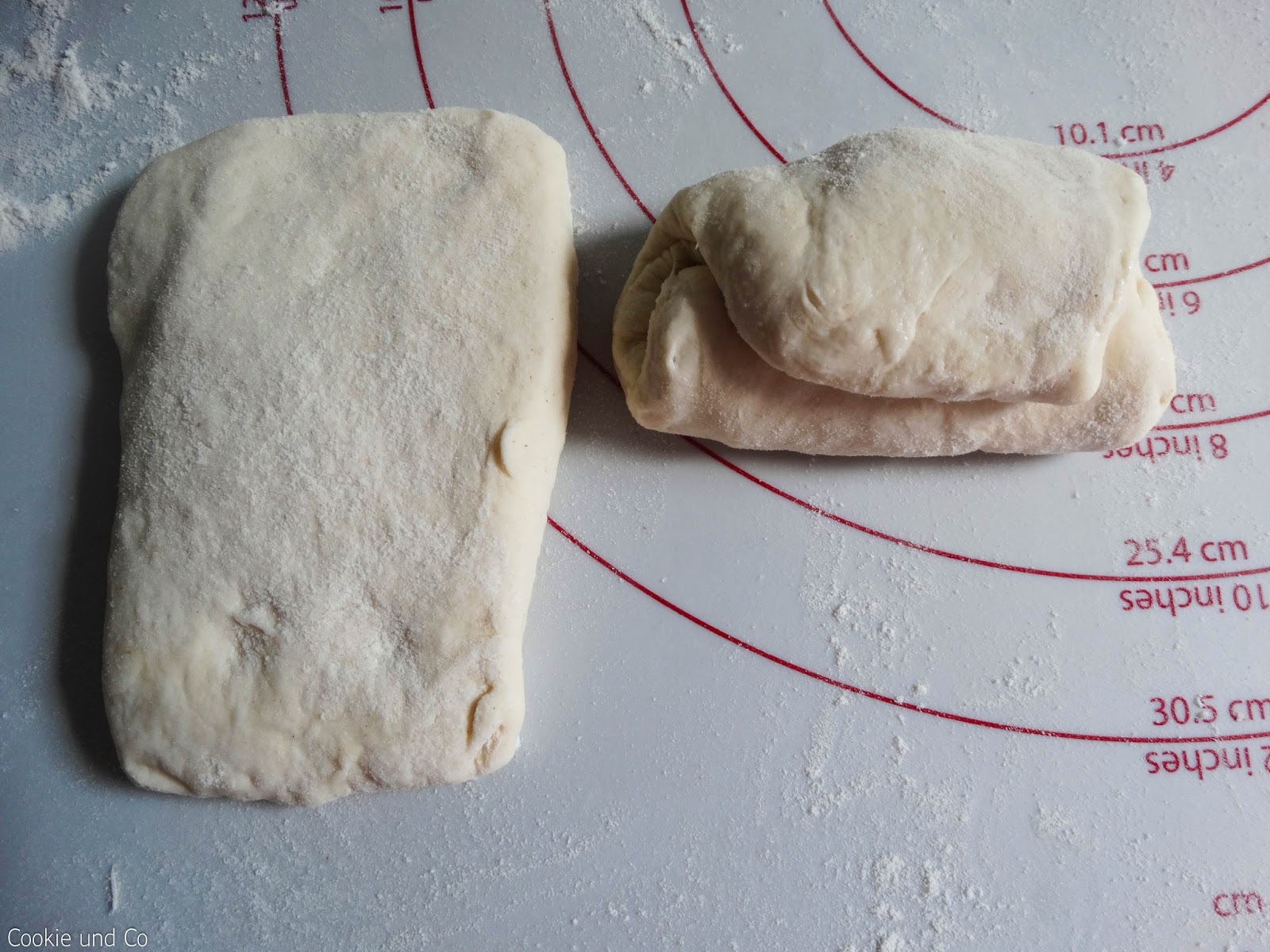 - Die Teiglinge vorsichtig flach drücken – möglichst ohne dabei Luft aus dem Teig zu drücken – und anschließend zu einem Teigling aufrollen.