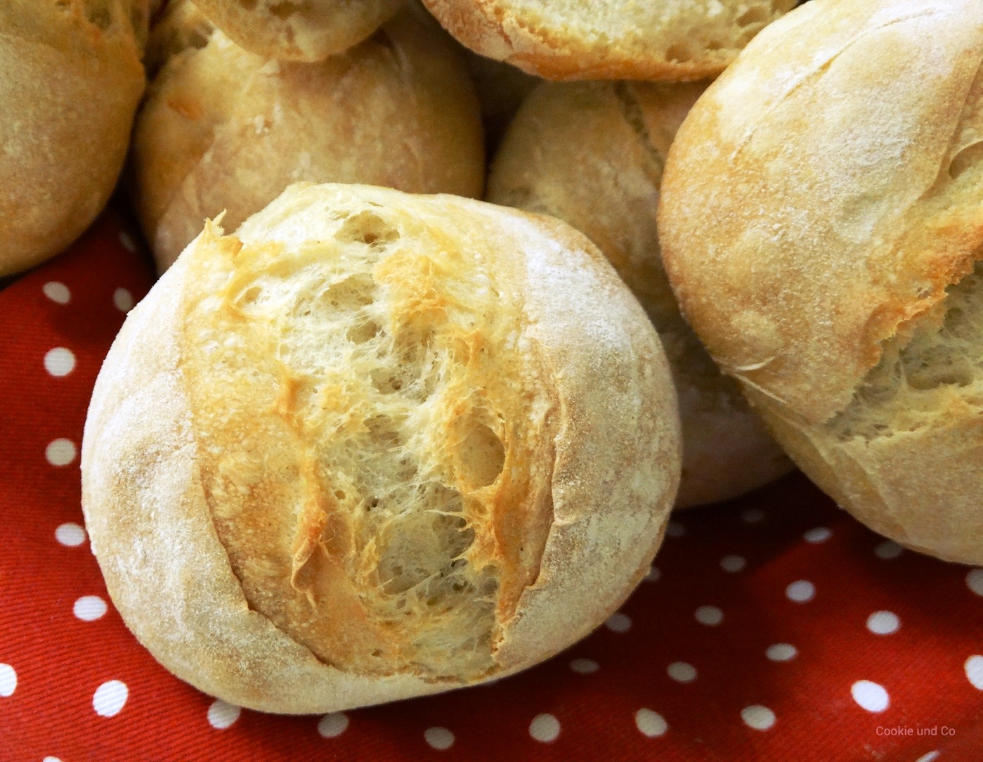 - Vor dem backen solltet ihr die Teiglinge mit etwas Wasser (nicht eiskalt) besprühen oder noch besser zu Backbeginn Schwaden (Dampfstoß), wenn ihr die Möglichkeit dazu habt.